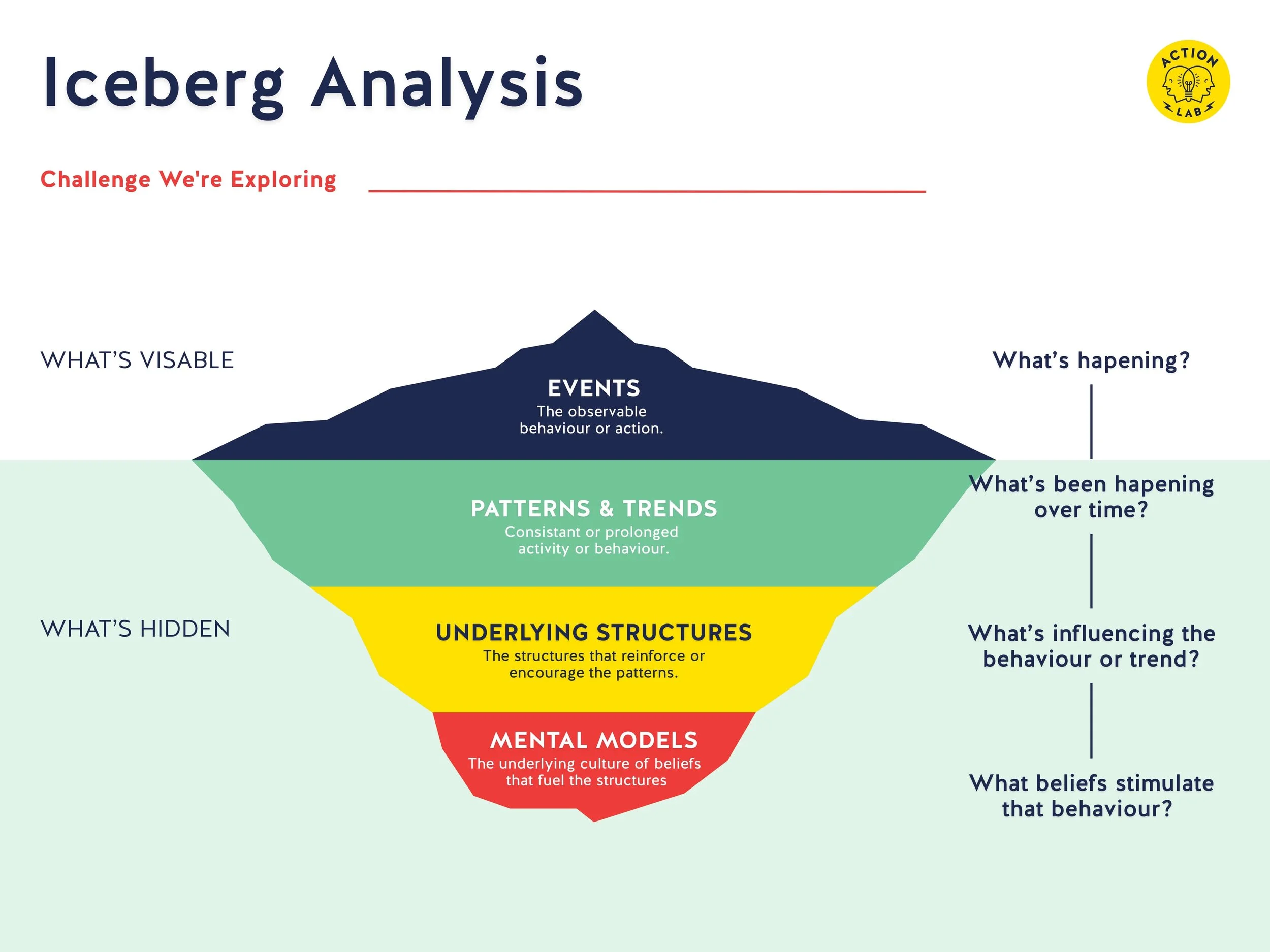 Iceberg Analysis is a systems thinking tool that helps teams look beyond surface-level events to uncover deeper patterns, structures, and mental models. It’s useful for strategy, systems change, and addressing recurring challenges by focusing on root causes rather than immediate reactions.